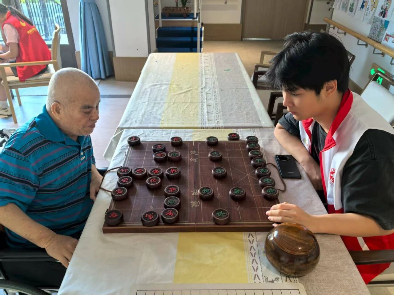 象棋区域同样热闹非凡。楚河汉界两侧,长者们与志愿者们展开了一场场智慧与勇气的较量。赖爷爷是养老机构里赫赫有名的象棋高手,这次他的对手是志愿者小李。