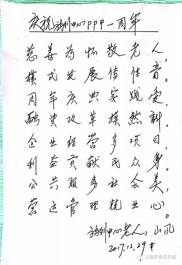 福田区福利中心PPP项目走过了一轮春夏秋冬,改革带来的变化每一位老人都看在眼里。因为装修改造,部分原住老人暂时回家居住。身在曹营心在汉的袁爷爷,每天都在关注福利中心的点点变化,牵挂着这里的老伙计们。福利中心PPP项目一周年生日之际,袁爷爷特作诗一首,赠与福利中心。谢谢袁爷爷的用心!