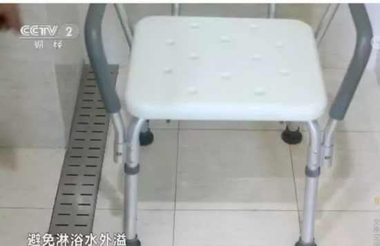 淋浴区设有带加热功能浴霸,浴前加热室内温度避免着凉,天花设有排风扇可及时的排走室内潮气,以免给长者带来憋闷感。淋帘既可防止水外溅也不影响护理员的操作。地面的水篦子可防止积水外溢到其它区域,淋浴区设有扶手供长者在洗浴移动时扶握。淋浴区一侧1.8米的位置设计有拉绳型呼叫器,便于长者的使用,1.8米的高可避免淋水误报。花洒与扶手组合并可上下调节,以满足坐姿和站姿的淋浴使用。
