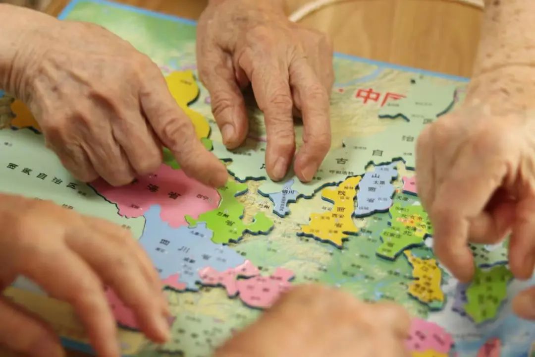榕悦·滨江中的小伙伴们通过介绍每个省份的代表物原来引导长者们拼全版图,长者们也在社工的带领下慢慢地回忆起了以前曾去过的地方。