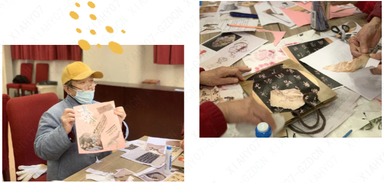 在活动预热阶段,社工找到院内在书画方面声望较高的戴老师进行探讨,戴老师十分支持这次富有新意的活动,为活动的开展给予了非常多的帮助。在此,南山二期也要向戴老师的助力表示感激。活动宣传海报一经贴出,长者们便好奇地向社工询问活动详情并参与报名。为了增加此次活动在院内的知晓度,社工耐心地逐一入户宣传,以致于活动宣传的第二天,名额便已经爆满。在这之后社工通过讲座的形式向长者们重点介绍了“八破图”的制作过程,可以根据个人的构思进行选材,经过裁剪、烧边、布局、拼贴、上色几个步骤就可以完成一副完整的“八破图”。