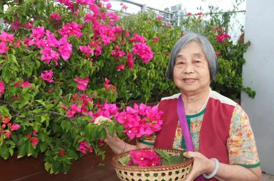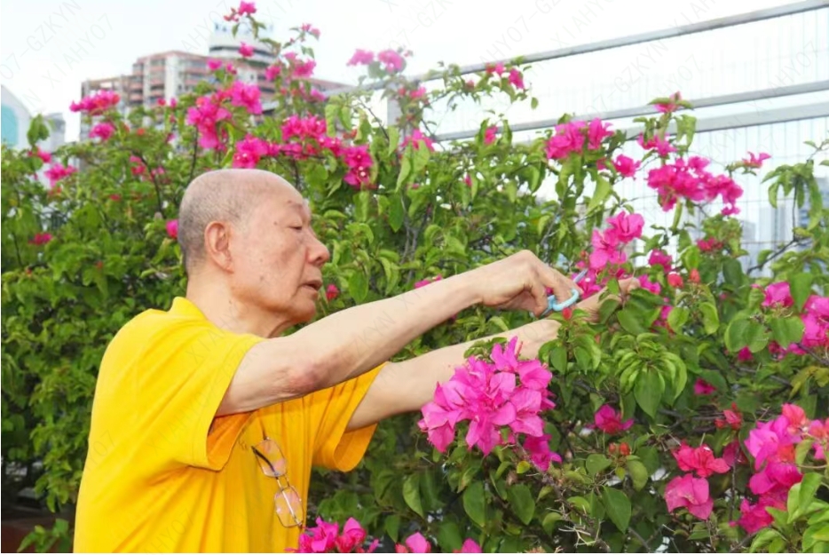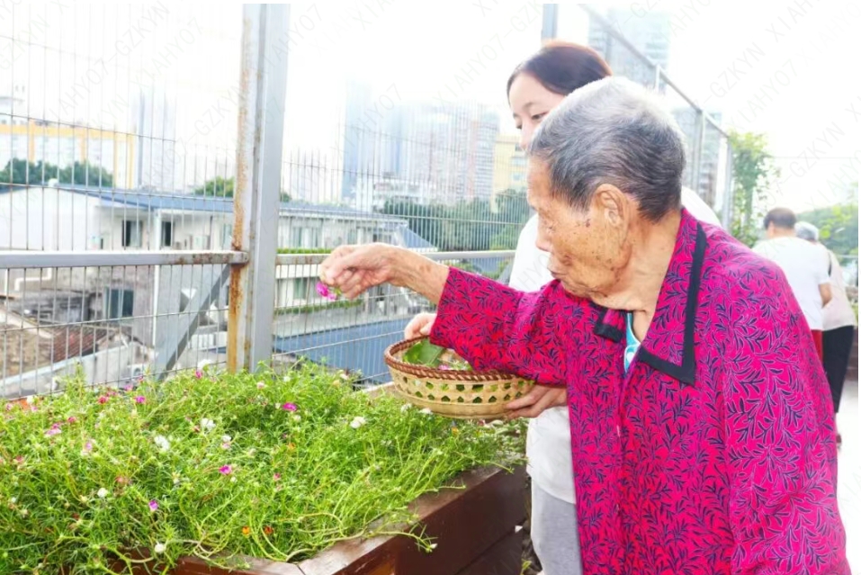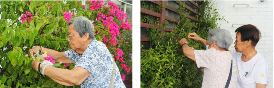 午后,长者们在社工的陪伴下,兴致勃勃登上五楼与九楼的空中花园。这里繁花似锦,三角梅热烈绽放,金银花清香袅袅,落叶纷飞如画,宛如一座藏满秋日秘密的“自然宝库”。