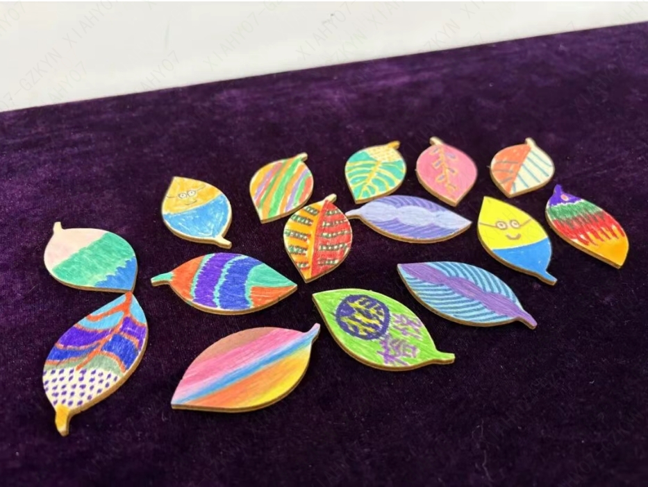 创作渐入佳境,现场只剩画笔轻触木片的沙沙声。郑姨年轻时便爱绘画,此刻得心应手——她勾勒轮廓,添上眼睛、鼻子与腮红,一幅可爱的“树叶娃娃”跃然而出。何姨赞叹:“你这手真巧!”郑姨笑着回应:“我最喜欢这些小玩意儿了。”