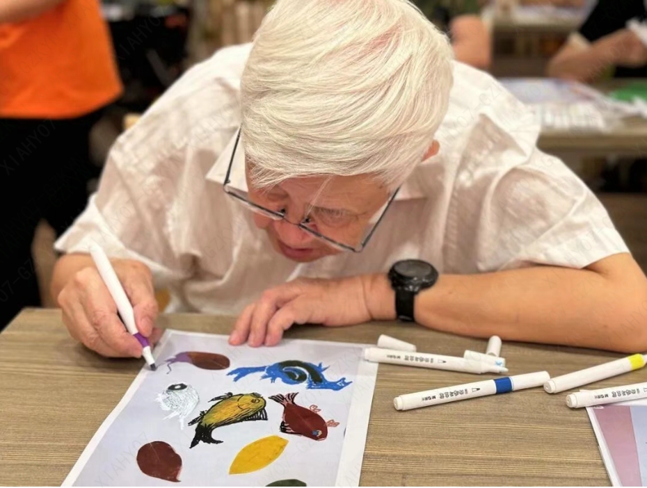 潘姨戴上老花镜,专注跟随社工动作;黄叔性子急,提笔就画,却不慎将颜料蹭到手上。文姨笑道:“看你黄叔,这下‘染’上秋天了吧!”众人会心一笑。