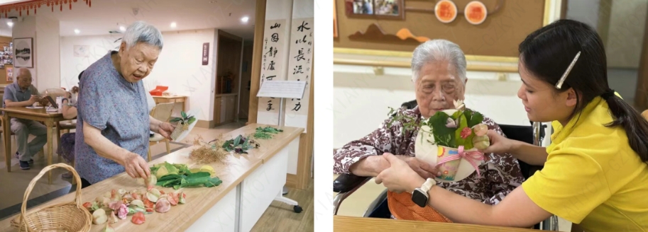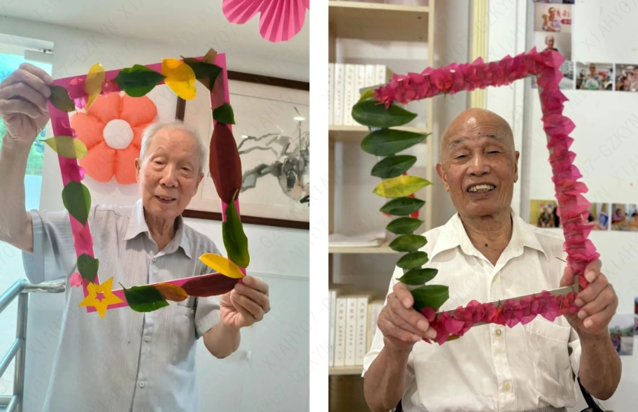 活动结束,长者们捧着独一无二的花篮,有的缀着桂花枝,有的绕着榕树枝,色彩与鲜花交织,成为院里最美风景。