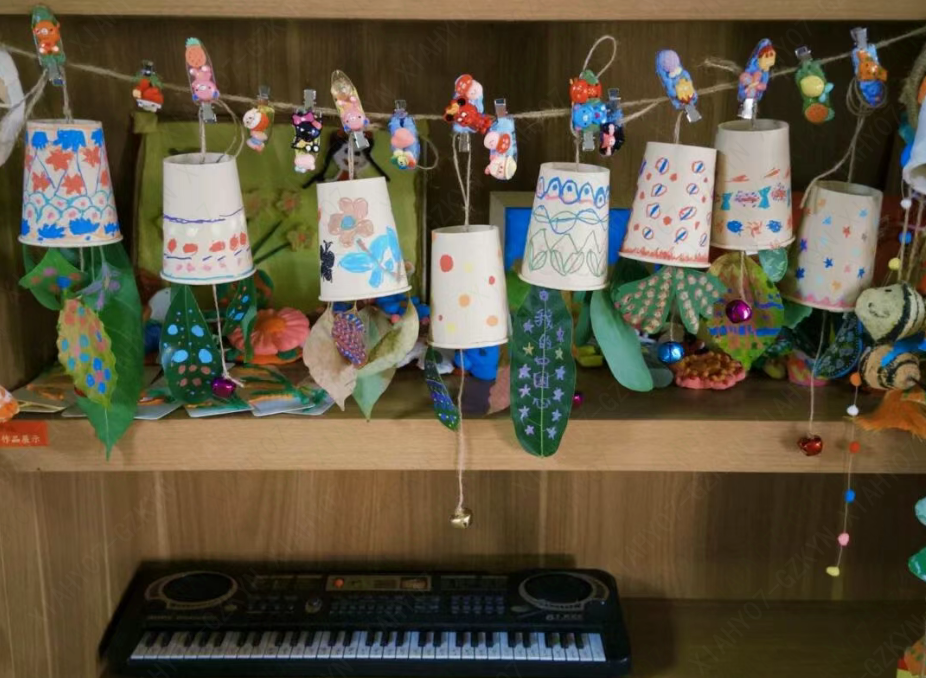 随后,大家有条不紊地组合起材料:将绘制好的树叶用麻绳轻轻系好,与清脆悦耳的铃铛一同挂在裁剪成型的纸杯边缘,再用麻绳穿出挂绳,一个个独一无二的树叶风铃便在大家的巧手下逐渐成型。