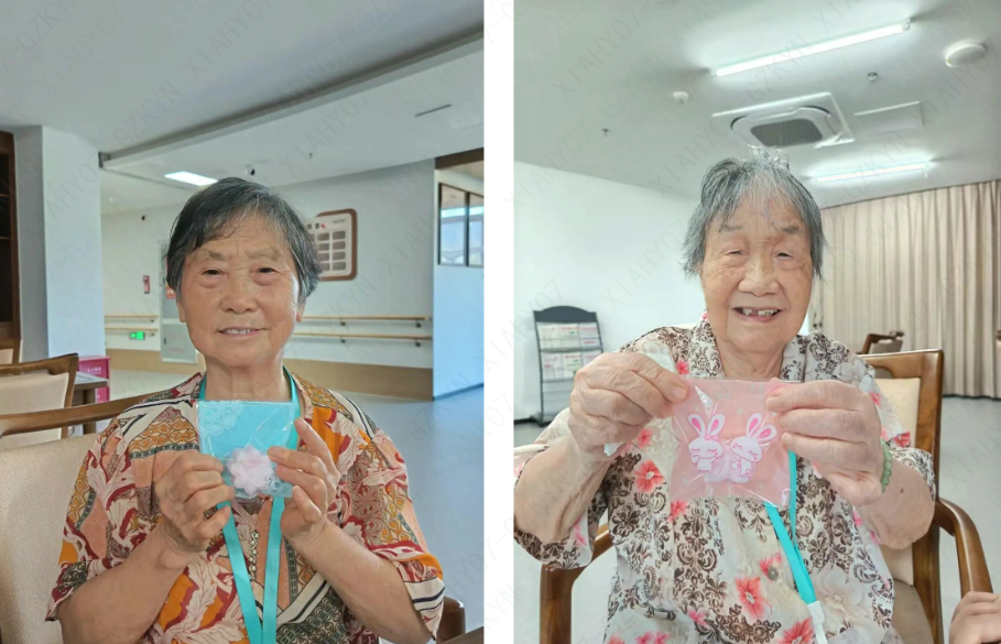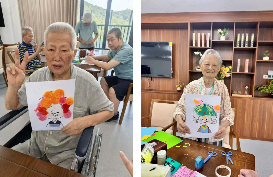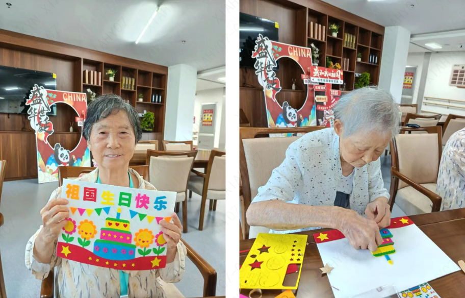 长者们怀揣对祖国的满腔热爱,认真创作国庆贴画。完成作品后,大家开心地与作品合影:“我要把这份心意带回家!”家属群中也传来赞许,“老妈说好久没这么开心了!”