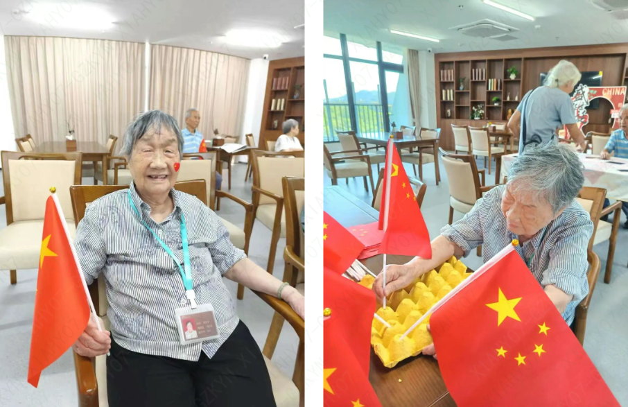 清晨,长者们一同观看升旗仪式,挥舞小红旗齐唱《歌唱祖国》,脸上写满自豪与喜悦。