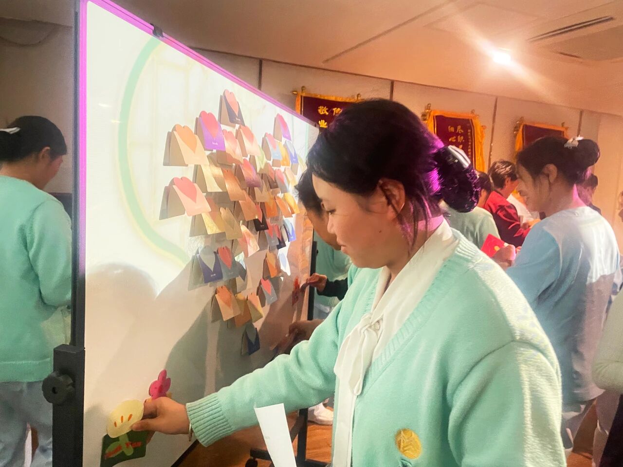 “送你一朵小红花”则让爱意流动起来。大家挑选心仪贺卡,写下心中想说的话,亲手递到想要感谢的同事手中。一句问候、一份心意,在此刻悄然传递,温暖彼此。