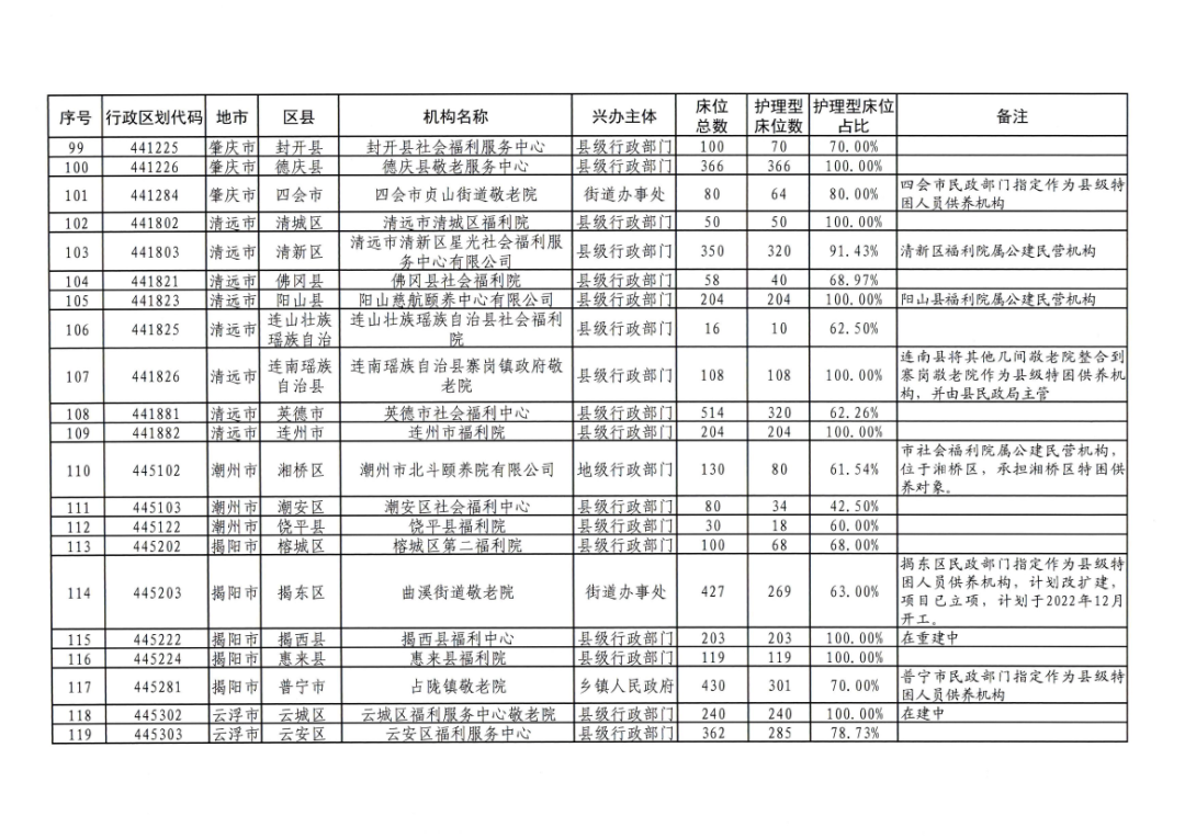 各地要按照《广东省民政厅关于积极推进养老机构护理型床位建设发展的通知》要求,切实做好特困人员供养服务设施(敬老院)护理型床位建设发展和监测工作,确保到2025年护理型养老床位占比不低于55%。各地政府投资新建或改扩建的特困人员供养服务设施(敬老院)原则上要符合《老年养老护院建设标准》,以护理型床位为主。对原有床位进行升级改造的,除配置符合条件的床具外,还应按比例配备护理人员及相关辅助器具,并对相关硬件设施进行适老化改造。支持各地对发展公办、民办养老机构的扶持优惠政策向护理型养老床位倾斜,对普通型床位和护理型床位实行差异化补助,加大护理型养老床位建设引导力度。鼓励有条件的地市,增加医疗护理和康复服务设备,探索发展家庭护理型养老床位,增强基本照护能力。