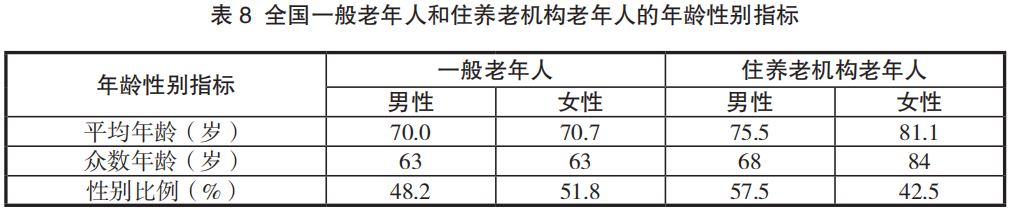 人口普查长表调查结果显示:全国老年人居住在养老机构的比例为0.73%(标准误为0.002%),其中男性老年人住在养老机构的比例为0.87%,女性老年人为0.60%,男性比例明显高于女性比例(差异在统计上高度显著)。